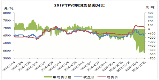 ????????近日,受市場(chǎng)供應(yīng)面有一定提升以及下游接貨不佳影響,PVC行情轉(zhuǎn)入跌勢(shì)。PVC期貨偏弱震蕩,對(duì)現(xiàn)貨市場(chǎng)價(jià)格形成一定打壓,市場(chǎng)價(jià)格承壓下跌。此外,期現(xiàn)貨價(jià)差再創(chuàng)新高,最高達(dá)570元/噸左右。由上圖可以看出,進(jìn)入2019年四季度,PVC期限價(jià)差逐漸擴(kuò)大,基本維持在500-600元/噸之間,而期貨價(jià)格遠(yuǎn)遠(yuǎn)低于現(xiàn)貨價(jià)格,超出正常范圍。因此單從期現(xiàn)價(jià)差方面看,后期將逐漸修復(fù)步入正軌,現(xiàn)貨大幅下降的可能性偏大。