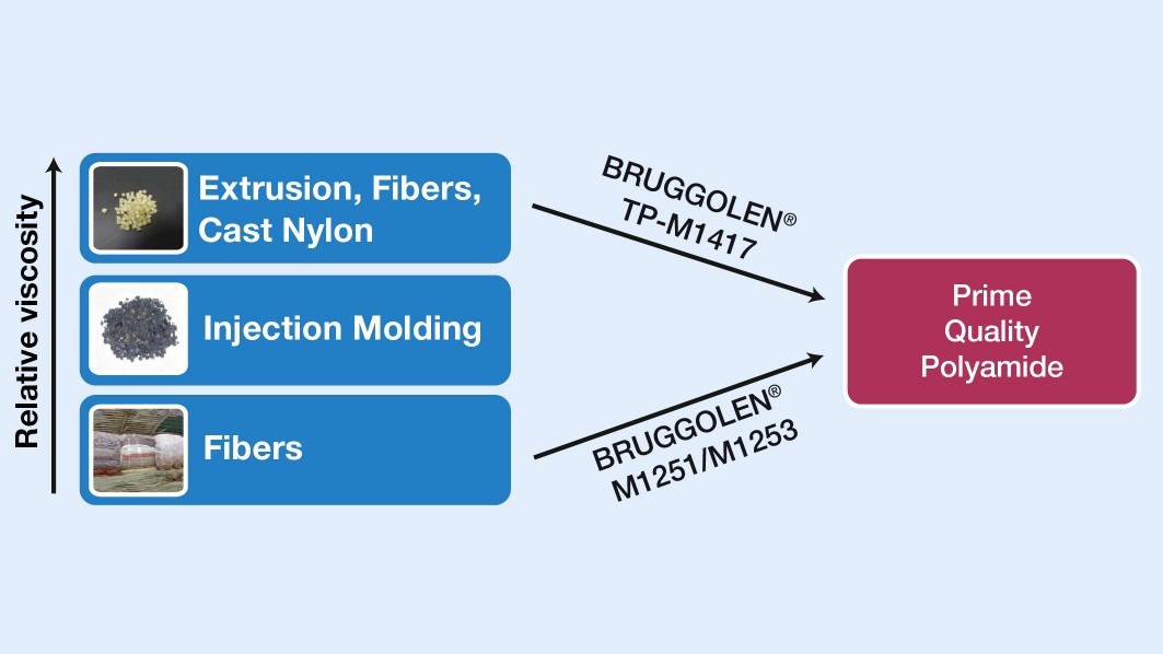 ????????在聚酰胺回收應用中,BRUGGOLEN M系列反應性鏈改性劑可通過延長過短的鏈或縮短過長的鏈來精確且可重現(xiàn)地調(diào)節(jié)相對粘度。