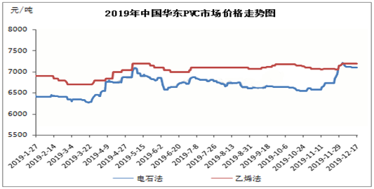 ????????2019年,PVC行情可謂是變化無(wú)常,全年呈現(xiàn)旺季不旺、淡季不淡的特點(diǎn)。與往年不同,全年價(jià)格最低點(diǎn)出現(xiàn)在3月份,而價(jià)格最高點(diǎn)出現(xiàn)在12月。截止12月中旬,PVC市場(chǎng)價(jià)格創(chuàng)新高后出現(xiàn)回落,各主銷地區(qū)市場(chǎng)價(jià)格陸續(xù)小幅松動(dòng),貿(mào)易商出貨多隨行就市為主,個(gè)別小幅讓利,下游依舊維持剛需,受利潤(rùn)空間影響,接貨并不積極。PVC期貨偏弱震蕩以及市場(chǎng)貨源緊缺狀態(tài)有所緩解是目前價(jià)格出現(xiàn)松動(dòng)的主要原因,但前期PVC生產(chǎn)廠家檢修后訂單良好,部分廠家貨源依舊不多仍然限制了PVC價(jià)格的回落空間。由上圖可以看出,12月上旬PVC華東市場(chǎng)價(jià)格雖出現(xiàn)松動(dòng),但空間十分有限。此外,PVC生產(chǎn)企業(yè)檢修已經(jīng)完成,預(yù)計(jì)后期供應(yīng)將有一定增加,市場(chǎng)貨源偏緊狀態(tài)將得到改善。