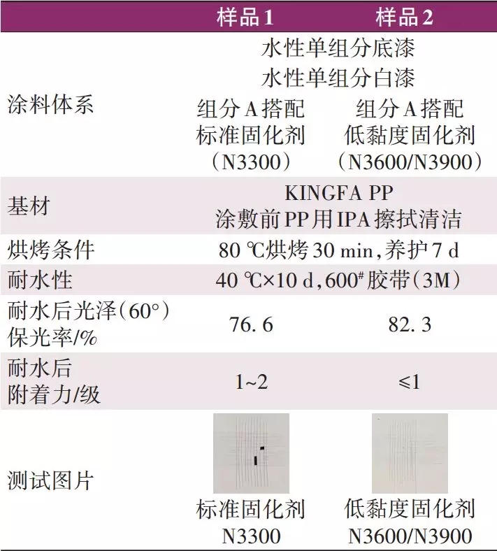 ????????在保險(xiǎn)杠清漆體系中,采用低黏度固化劑,不僅能有效降低清漆中有機(jī)溶劑的含量,降低VOC排放,而且在性能方面也具有很大的改善,例如保光性、附著力和耐水性能。表2為采用相同的水性單組分底漆、水性單組分色漆以及清漆的A組分,樣品1使用的是標(biāo)準(zhǔn)三聚體的固化劑,樣品2采用的是低黏度固化劑[m(N3600)∶m(N3900)=1∶1混拼]。