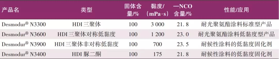 ????????保險(xiǎn)杠用清漆體系,目前以溶劑型雙組分聚氨酯涂料為主。2006年曾有水性高光清漆用于塑料涂裝,但是由于施工可操作性的限制,并未得到廣泛應(yīng)用。在VOC法規(guī)的推動(dòng)下,為進(jìn)一步降低VOC排放,高固清漆成為研究熱點(diǎn)。采用低黏度的固化劑可使用較少溶劑即能調(diào)節(jié)涂料至施工黏度,顯著減少溶劑的使用,并達(dá)到較高的施工固含。表1為科思創(chuàng)推出的可用于保險(xiǎn)杠高固清漆配方的固化劑產(chǎn)品。