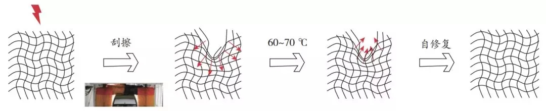 ????????保險(xiǎn)杠清漆需具有優(yōu)異的外觀、耐化學(xué)品以及耐候性,以保護(hù)保險(xiǎn)杠不受外界氣候、紫外傷害、化學(xué)品侵蝕以及物理或洗車時(shí)的刮蹭,此外還需與基材有良好的匹配性。目前絕大部分的保險(xiǎn)杠清漆都是雙組分聚氨酯涂料體系。雙組分聚氨酯可以通過原材料的選擇搭配,匹配保險(xiǎn)杠基材的韌性,并且在80℃的低溫烘烤下,依然能滿足流平均勻、高光澤、高飽滿度、以及耐候耐化學(xué)品的要求。另外,優(yōu)化過的雙組分聚氨酯清漆具有明顯的自修復(fù)功能,即使被刮傷后也能自修復(fù)到原有的高光澤外觀。最通常使用的雙組分聚氨酯涂料就是通過異氰酸酯基團(tuán)(—NCO)和主樹脂中的活性羥基(—OH)反應(yīng)來交聯(lián),從而達(dá)到優(yōu)異的漆膜性能。使用脂肪族多異氰酸酯的聚氨酯體系,具備優(yōu)異的耐候性;雙組分聚氨酯交聯(lián)后形成的氨酯鍵能夠耐多種化學(xué)品;氨酯鍵之間還能形成氫鍵,使漆膜硬且柔韌,具有抗石擊、耐刮擦甚至自修復(fù)等功能;而這些功能都是汽車涂料所要求的。圖9為聚氨酯涂膜的自修復(fù)過程示意圖。