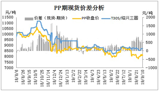 ????????由PP期現(xiàn)貨價差對比發(fā)現(xiàn),期現(xiàn)貨價差在七八月份價差明顯擴大化,進入九月份期貨受資金面及供需面支撐,期貨連漲助推期現(xiàn)貨價差逐步收窄。商家受長期利潤虧損影響,面對期貨連漲局勢,炒作心態(tài)油然而生。目前因國內(nèi)PP產(chǎn)能集中檢修,市場供應(yīng)面利好支撐市場報盤。期現(xiàn)貨價差受供需影響有進一步收窄趨勢。