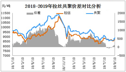 ????????2018-2019年P(guān)P拉絲、共聚在7-8月處于僵持低迷狀態(tài),業(yè)者對長期成交疲態(tài)市場看空情緒明顯加重。商家因擔憂后市,低價甩貨明顯增多。9月市場受兩油庫存快速消耗及期貨連漲支撐,市場呈現(xiàn)絕地反彈局勢,拉絲與共聚價差逐步拉開距離。目前拉絲與共聚價差已經(jīng)由原來持平狀態(tài),擴大至100-200元/噸。根據(jù)目前拉絲與共聚成本價差計算,共聚高于拉絲300-400元/噸屬于正常價差,拉絲與共聚有價差有進一步擴大趨勢。