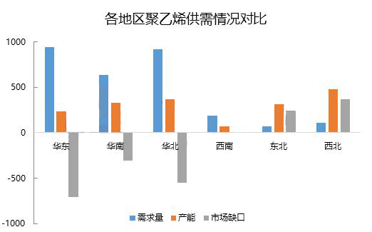????????近年國內(nèi)產(chǎn)能的不斷增加,各地區(qū)供需情況也有所改變。東北地區(qū)是我國老工業(yè)基地,是中油系統(tǒng)裝置集中地區(qū),東北地區(qū)下游需求占國內(nèi)需求占比較小,是國內(nèi)PE產(chǎn)品輸出型地區(qū)。另外,西北地區(qū)依托豐富的煤炭資源,近年煤制裝置搞通文化路,西北地區(qū)產(chǎn)能快速增長。西北地區(qū)同東北地區(qū)一樣,產(chǎn)能分布集中,但下游需求較少,也是我國主要的PE產(chǎn)品輸出地。國內(nèi)主要的下游需求地區(qū)為華東地區(qū)、華南地區(qū)和華北地區(qū)。其中,最大的消費地區(qū)為華東地區(qū),華東地區(qū)聚乙烯消費點全國總消費量的三分之一左右,但華東地區(qū)當?shù)負碛械漠a(chǎn)能有限,占全國總產(chǎn)能的13%。華東地區(qū)年PE消費量在900萬噸以上,進口產(chǎn)品充斥華東市場。華東區(qū)域是PE產(chǎn)品最大的凈流入地區(qū),隨著國際與國內(nèi)的快速擴能,華東地區(qū)是進口產(chǎn)品與國產(chǎn)產(chǎn)品必爭之地,價格競爭也將進入白熱化狀態(tài),未來華東地區(qū)很可能成為國內(nèi)價格洼地,進口低價產(chǎn)品對市場價格沖擊明顯。華北地區(qū)與華南地區(qū)作為主要的消費地區(qū),情況與華東地區(qū)相類似,是國內(nèi)外PE產(chǎn)品的主要消費目的地,來自供應端的壓力不斷增加,市場競爭日益加劇。