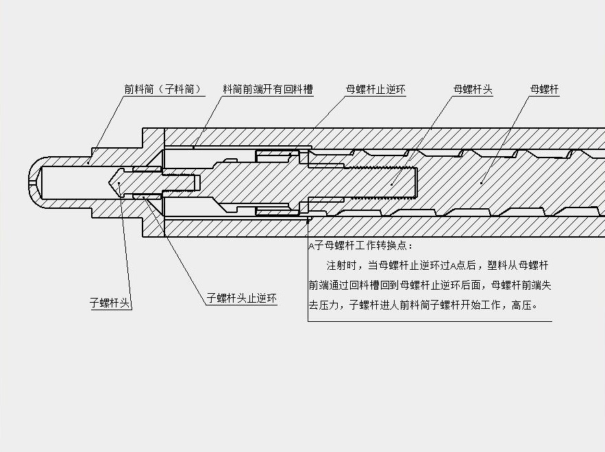 ????????注塑機(jī)根據(jù)產(chǎn)品的大小加足相應(yīng)的原料,加料結(jié)束后,開(kāi)始注射,螺桿向前運(yùn)動(dòng),母螺桿頭上的母止逆環(huán)及子螺桿頭上的子止逆環(huán)滑向后端并閉合母螺桿頭上的進(jìn)料通道,塑料在螺桿的推動(dòng)下從前料筒的噴嘴射入模具,此時(shí)模腔注射壓力不用太高,當(dāng)塑料快沖人模腔注射壓力會(huì)慢慢升高,注射到最后階段時(shí),子螺桿頭進(jìn)入前料筒同時(shí)母止逆環(huán)后端移動(dòng)到回流槽的通道口(A點(diǎn)是母螺桿與子螺桿工作的轉(zhuǎn)換點(diǎn)),塑料從回流槽繞過(guò)母螺桿止逆環(huán)到其后端,母螺桿頭的前端失去壓力,此時(shí)子螺桿頭在前料筒中起作用,因子螺桿頭的端部面積可以做得比母螺桿頭的端部面積小很多(根據(jù)實(shí)際需要端部面積可以做到小達(dá)幾倍,相應(yīng)的產(chǎn)生的壓力也可以是母螺桿頭產(chǎn)生的壓力的幾倍,一般模腔壓為250~300cm2/kg),所以模腔壓力是高壓,也可以是超高壓每平方厘米在一千公斤以上,可以滿足任何塑料產(chǎn)品的要求(用昂貴的氣體輔助注射設(shè)備最高也只能到每平方厘米700公斤),靈活調(diào)節(jié)注塑機(jī)電腦控制最后一段注射和一級(jí)二級(jí)保壓壓力,加工出來(lái)的塑料產(chǎn)品可以做到無(wú)縮印,高品質(zhì),高密度,高強(qiáng)度。