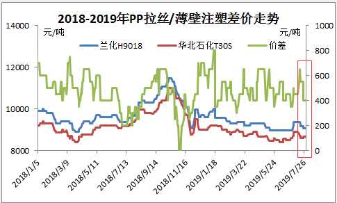 ????????從上圖可以看出,7月份,PP拉絲料/薄壁注塑料價(jià)差開始出現(xiàn)縮小趨勢(shì)。6月底7月初,薄壁注塑料和拉絲料價(jià)差在600元/噸左右,7月底,價(jià)差縮小至400元/噸,在利潤(rùn)方面一直占有優(yōu)勢(shì)的薄壁注塑料,開始逐漸走下神壇。