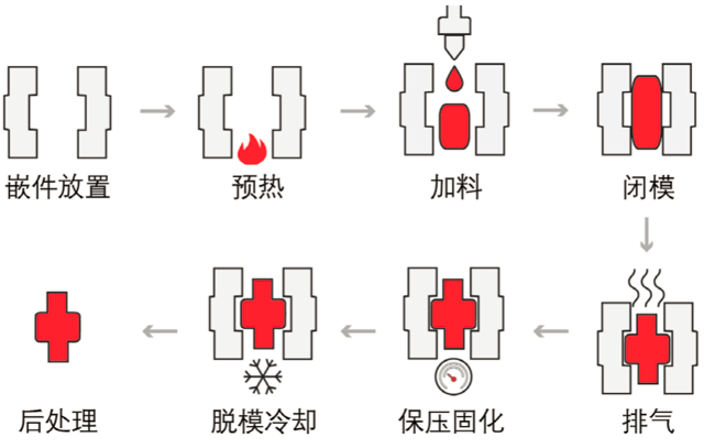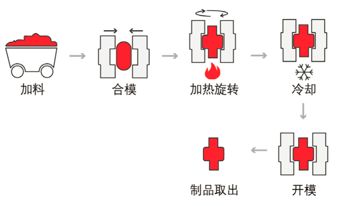 主要用于熱固性塑料制品的生產(chǎn)。成型經(jīng)過(guò)加熱使其熔化,加壓沖模,再經(jīng)過(guò)加熱交聯(lián)固化,脫模后既得制品。