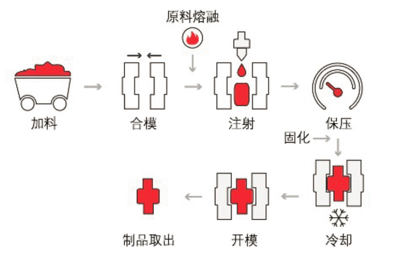 3.在柱塞或螺桿的加壓下物料被壓縮并向前移動(dòng),通過(guò)機(jī)筒前的射嘴以很快的速度注入較低溫度的閉合模腔內(nèi);