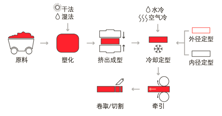借助螺桿或柱塞的擠壓作用,使受熱熔融的高分子材料在壓力的推動(dòng)下,強(qiáng)行通過(guò)機(jī)頭模具而成型為具有恒定截面連續(xù)型材。目前我國(guó)擠出成型制品占塑料制品總量的1/3以上。