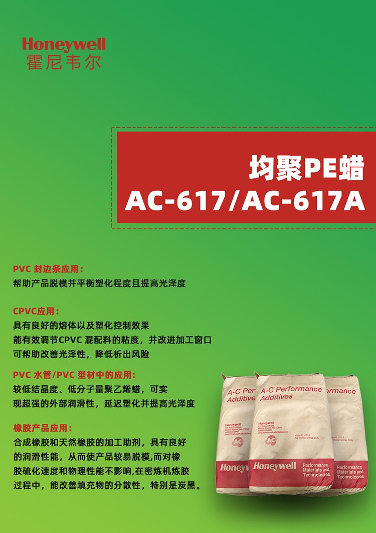 霍尼韋爾HoneywellAC-617A聚乙烯蠟是一種低密度非氧化的聚乙烯蠟,AC-617A聚乙烯蠟應(yīng)用在產(chǎn)品中可提高擠出速率、并保持表面的光澤度。在塑料、PVC塑料、PVC專(zhuān)用潤(rùn)滑劑的應(yīng)用非常廣泛。