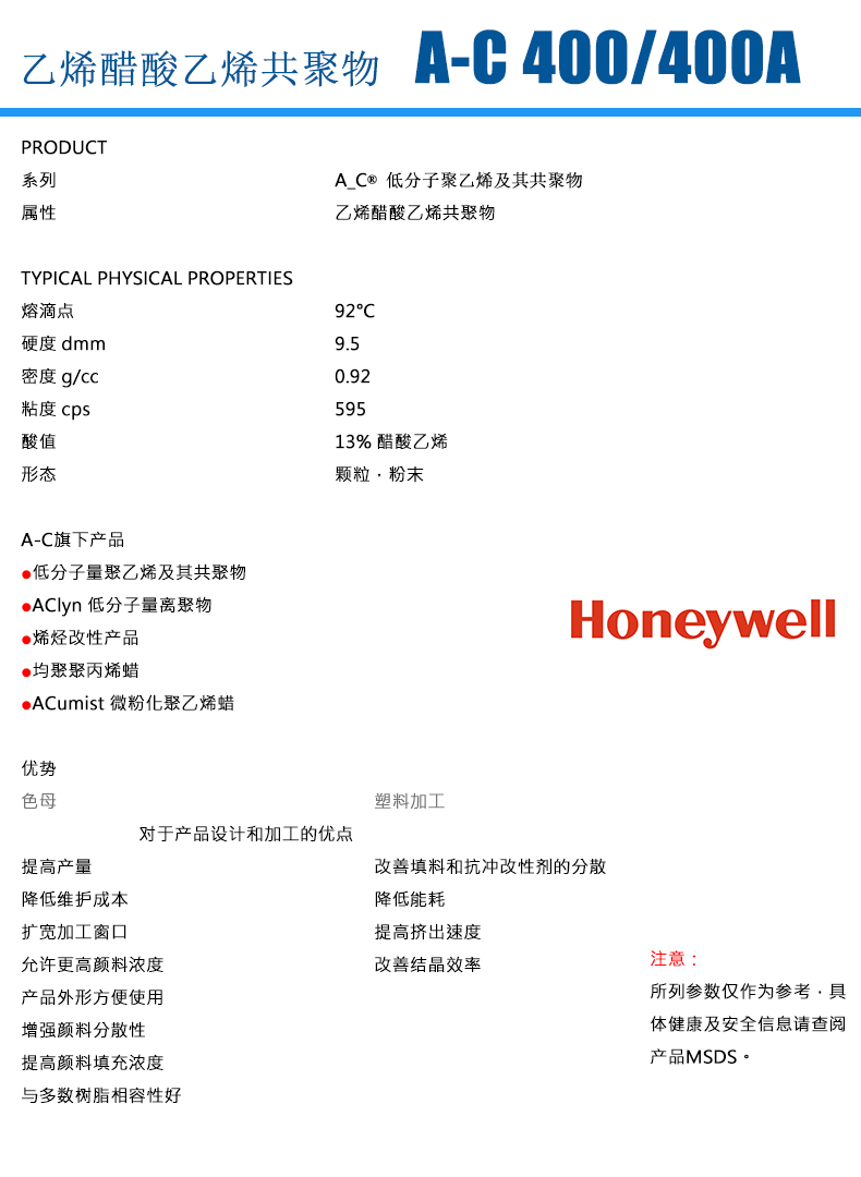 - 霍尼韋爾 honeywell EVA蠟 乙烯-醋酸乙烯共聚物蠟 AC-400A 顏料分散劑 物性表, 霍尼韋爾 honeywell EVA蠟 乙烯-醋酸乙烯共聚物蠟 AC-400A 顏料分散劑 產(chǎn)品參數(shù),霍尼韋爾 honeywell EVA蠟 乙烯-醋酸乙烯共聚物蠟 AC-400A 顏料分散劑 性能表,霍尼韋爾 honeywell EVA蠟 乙烯-醋酸乙烯共聚物蠟 AC-400A 顏料分散劑 出廠報(bào)告, MSDS,, 物質(zhì)安全資料表, UL黃卡,{ SGS報(bào)告, RoHS, 食品級認(rèn)證, NSF飲用水標(biāo)準(zhǔn), 產(chǎn)品資料, 產(chǎn)品性能, 出廠報(bào)告, 原廠原包, 代理商, 熱變形溫度, 熔指數(shù), 流動(dòng)系數(shù), 抗沖擊性能、沖擊強(qiáng)度, 低溫韌性、低溫抗沖擊性能, 熔體流動(dòng)系數(shù)、熔體流動(dòng)速率, 加工工藝、加工參數(shù)、加工溫度, 歐盟RoHS 德國FDA 美國FDA 日本FDA