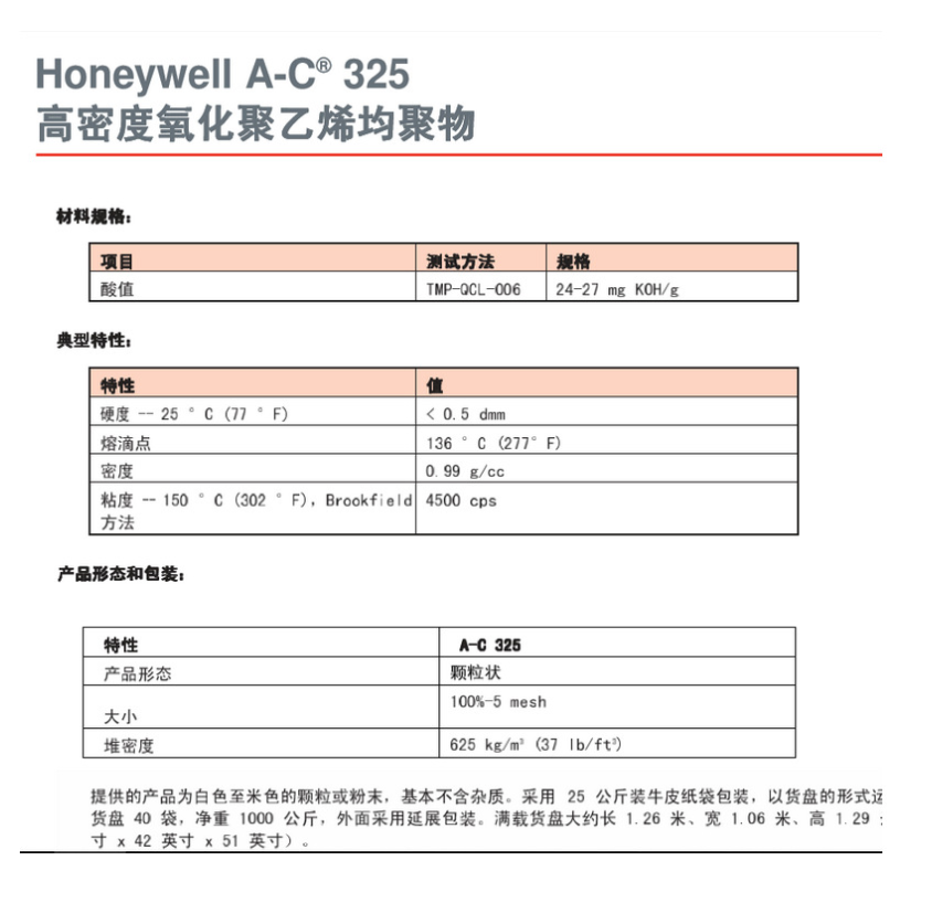 - Honeywell霍尼韋爾氧化聚乙烯蠟 A-C 325 蠟粉 酸值高易乳化 物性表, Honeywell霍尼韋爾氧化聚乙烯蠟 A-C 325 蠟粉 酸值高易乳化 產(chǎn)品參數(shù),Honeywell霍尼韋爾氧化聚乙烯蠟 A-C 325 蠟粉 酸值高易乳化 性能表,Honeywell霍尼韋爾氧化聚乙烯蠟 A-C 325 蠟粉 酸值高易乳化 出廠報(bào)告, MSDS,, 物質(zhì)安全資料表, UL黃卡,{ SGS報(bào)告, RoHS, 食品級認(rèn)證, NSF飲用水標(biāo)準(zhǔn), 產(chǎn)品資料, 產(chǎn)品性能, 出廠報(bào)告, 原廠原包, 代理商, 熱變形溫度, 熔指數(shù), 流動系數(shù), 抗沖擊性能、沖擊強(qiáng)度, 低溫韌性、低溫抗沖擊性能, 熔體流動系數(shù)、熔體流動速率, 加工工藝、加工參數(shù)、加工溫度, 歐盟RoHS 德國FDA 美國FDA 日本FDA