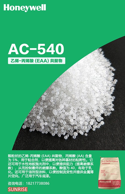 霍尼韋爾A-C 540A為粉末狀的乙烯-丙烯酸 (EAA) 共聚物,丙烯酸 (AA) 含量為 5%,用于粘合劑,以便提高對(duì)各種基材的粘附性?;裟犴f爾PE蠟A-C 540A還可用于水性地板拋光劑中,以便提供阻力(提高磨擦系數(shù))?;裟犴f爾PE蠟A-C 540A酸值為40,有助于乳化。還可用于溶劑型涂料,以便控制流變性并提供金屬薄片定向。廣泛用于汽車底漆。霍尼韋爾PE蠟A-C 540A還可用于色母粒和工程樹脂的分散劑。