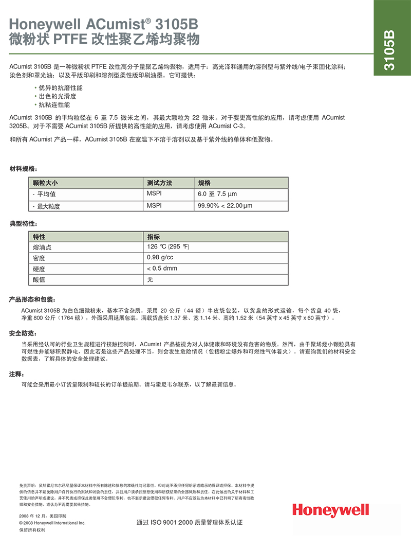 - 美國(guó)霍尼韋爾ACumist 3105B 聚四氟乙烯聚乙烯混合蠟粉 物性表, 美國(guó)霍尼韋爾ACumist 3105B 聚四氟乙烯聚乙烯混合蠟粉 產(chǎn)品參數(shù),美國(guó)霍尼韋爾ACumist 3105B 聚四氟乙烯聚乙烯混合蠟粉 性能表,美國(guó)霍尼韋爾ACumist 3105B 聚四氟乙烯聚乙烯混合蠟粉 出廠報(bào)告, MSDS,, 物質(zhì)安全資料表, UL黃卡,{ SGS報(bào)告, RoHS, 食品級(jí)認(rèn)證, NSF飲用水標(biāo)準(zhǔn), 產(chǎn)品資料, 產(chǎn)品性能, 出廠報(bào)告, 原廠原包, 代理商, 熱變形溫度, 熔指數(shù), 流動(dòng)系數(shù), 抗沖擊性能、沖擊強(qiáng)度, 低溫韌性、低溫抗沖擊性能, 熔體流動(dòng)系數(shù)、熔體流動(dòng)速率, 加工工藝、加工參數(shù)、加工溫度, 歐盟RoHS 德國(guó)FDA 美國(guó)FDA 日本FDA