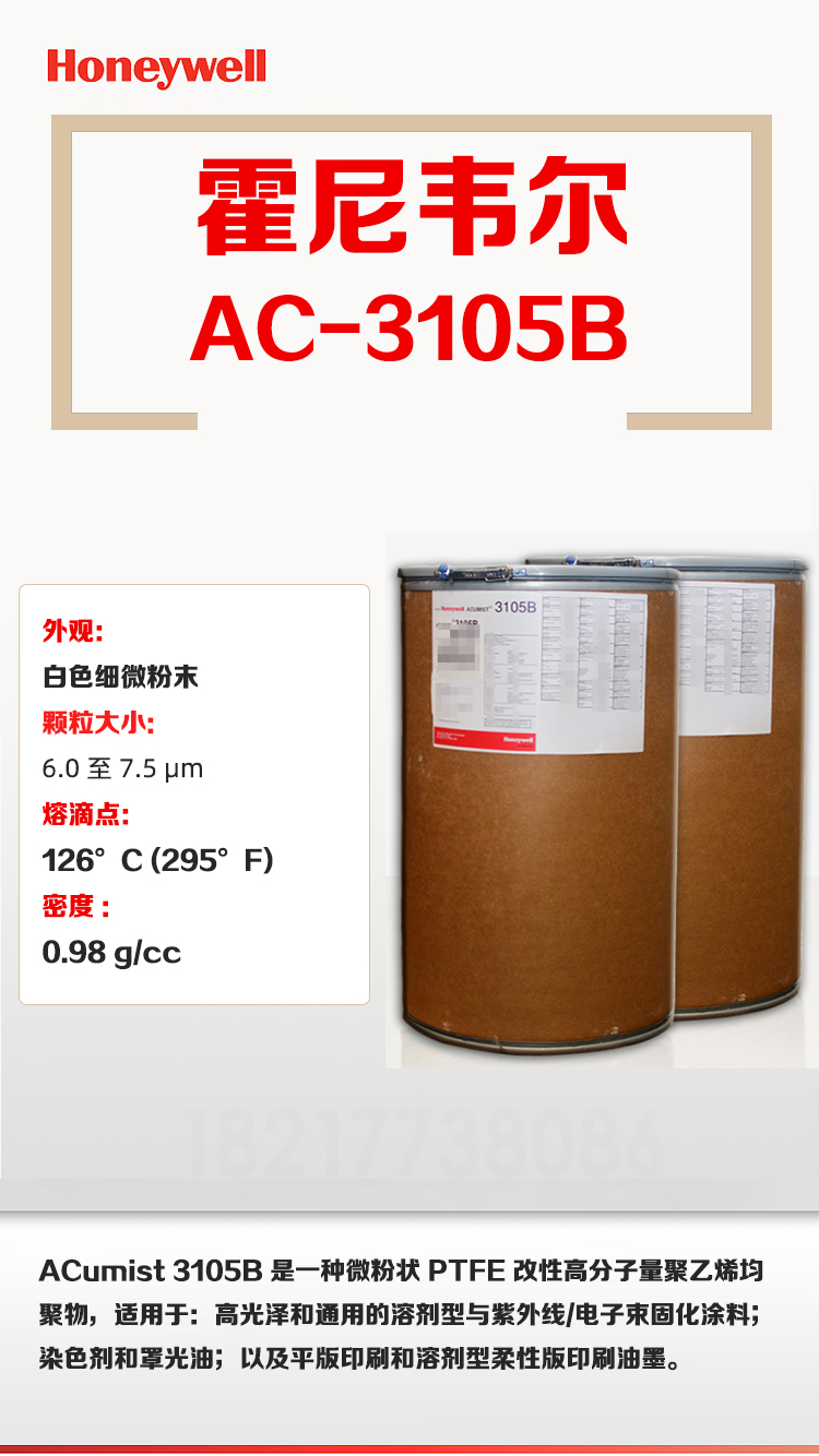 ACumist 3105B是一種微粉狀PTFE改性高分子量聚乙烯均聚物,適用于:高光澤和通用的溶劑型與紫外線/電子束固化涂料;