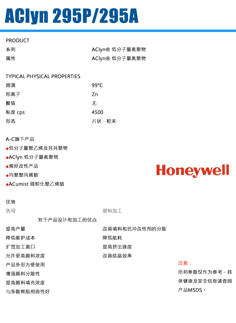 - Honeywell(霍尼韋爾) Acyln 295A低分子量離聚物 PBT尼龍成核劑 物性表, Honeywell(霍尼韋爾) Acyln 295A低分子量離聚物 PBT尼龍成核劑 產(chǎn)品參數(shù),Honeywell(霍尼韋爾) Acyln 295A低分子量離聚物 PBT尼龍成核劑 性能表,Honeywell(霍尼韋爾) Acyln 295A低分子量離聚物 PBT尼龍成核劑 出廠報(bào)告, MSDS,, 物質(zhì)安全資料表, UL黃卡,{ SGS報(bào)告, RoHS, 食品級認(rèn)證, NSF飲用水標(biāo)準(zhǔn), 產(chǎn)品資料, 產(chǎn)品性能, 出廠報(bào)告, 原廠原包, 代理商, 熱變形溫度, 熔指數(shù), 流動系數(shù), 抗沖擊性能、沖擊強(qiáng)度, 低溫韌性、低溫抗沖擊性能, 熔體流動系數(shù)、熔體流動速率, 加工工藝、加工參數(shù)、加工溫度, 歐盟RoHS 德國FDA 美國FDA 日本FDA