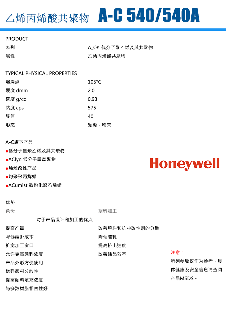 - 霍尼韋爾honeywell A-C540A適合用于尼龍改性材料 乙烯-丙烯酸共聚物 物性表, 霍尼韋爾honeywell A-C540A適合用于尼龍改性材料 乙烯-丙烯酸共聚物 產(chǎn)品參數(shù),霍尼韋爾honeywell A-C540A適合用于尼龍改性材料 乙烯-丙烯酸共聚物 性能表,霍尼韋爾honeywell A-C540A適合用于尼龍改性材料 乙烯-丙烯酸共聚物 出廠報(bào)告, MSDS,, 物質(zhì)安全資料表, UL黃卡,{ SGS報(bào)告, RoHS, 食品級(jí)認(rèn)證, NSF飲用水標(biāo)準(zhǔn), 產(chǎn)品資料, 產(chǎn)品性能, 出廠報(bào)告, 原廠原包, 代理商, 熱變形溫度, 熔指數(shù), 流動(dòng)系數(shù), 抗沖擊性能、沖擊強(qiáng)度, 低溫韌性、低溫抗沖擊性能, 熔體流動(dòng)系數(shù)、熔體流動(dòng)速率, 加工工藝、加工參數(shù)、加工溫度, 歐盟RoHS 德國FDA 美國FDA 日本FDA