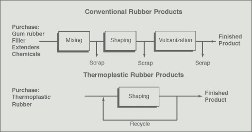 熱塑性彈性體可以反復(fù)加工的特點(diǎn),決定了它優(yōu)于熱固性橡膠的主要優(yōu)越性。兩者在加工方面的其它關(guān)鍵性區(qū)別如下表所示。