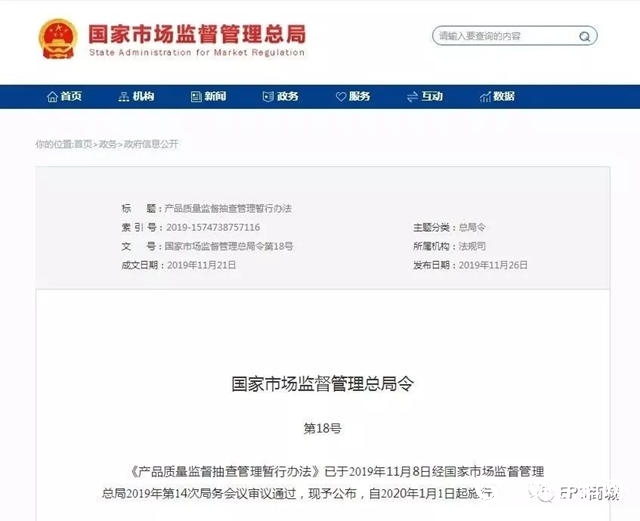 ????????第五十六條 本辦法自2020年1月1日起施行。2010年12月29日原國家質(zhì)量監(jiān)督檢驗(yàn)檢疫總局令第133號(hào)公布的《產(chǎn)品質(zhì)量監(jiān)督抽查管理辦法》、2014年2月14日原國家工商行政管理總局令第61號(hào)公布的《流通領(lǐng)域商品質(zhì)量抽查檢驗(yàn)辦法》、2016年3月17日原國家工商行政管理總局令第85號(hào)公布的《流通領(lǐng)域商品質(zhì)量監(jiān)督管理辦法》同時(shí)廢止。