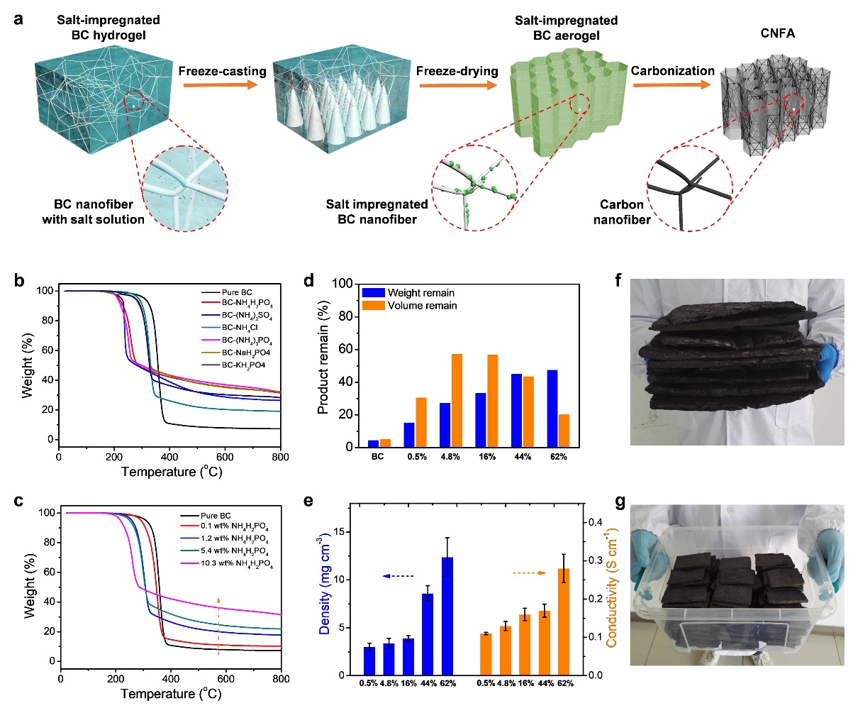 ????????圖1、宏觀尺寸CNFAs的合成。(a)CNFAs制造工藝示意圖;(b)純BC和BC浸漬NH4H2PO4、(NH4)2SO4、NH4Cl、(NH4)3PO4、NaH2PO4或KH2PO4的TG曲線;(c)純BC和BC浸漬不同濃度NH4H2PO4后的TG曲線;(d)以純BC和BC為原料,在800°C下加入不同量的NH4H2PO4炭化制備CNFAs(NH4H2PO4的重量比分別為0.5、4.8、16、44和62 wt%);(e)1200 ℃下制備的CNFAs的密度和導(dǎo)電性;(f ~g)在800℃下制備的CNFAs照片,展示了其可以大規(guī)模制備。