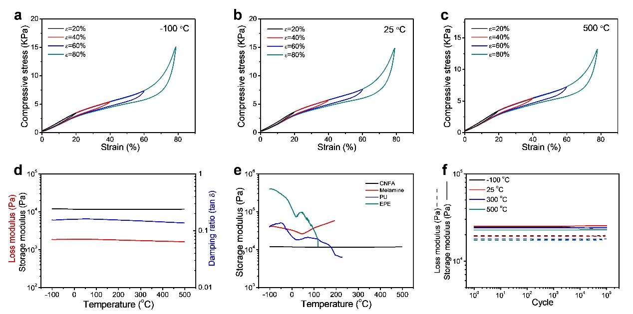 ????????圖2、CNFAs在T = -100~500℃時(shí)N2中的熱力學(xué)穩(wěn)定的力學(xué)性能。(a~c)形變?yōu)?0%、40%、60%和80%時(shí)CNFAs的壓縮應(yīng)力-應(yīng)變曲線,溫度分別為:a)-100 °C、b)25 °C和c)500 °C;(d)CNFAs在T = -100-500℃時(shí)的粘彈性(儲(chǔ)存模量、損耗模量和阻尼比);(e)CNFA、三聚氰胺、PU和EPE泡沫的儲(chǔ)存模量隨溫度的變化;(f)不同溫度下CNFAs在1×105次循環(huán)中的儲(chǔ)存模量和損耗模量。