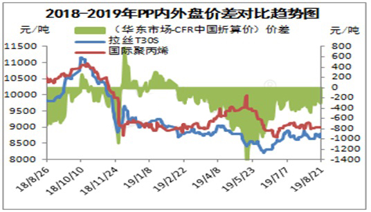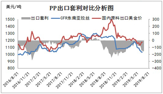 ????????面對(duì)國(guó)內(nèi)PP產(chǎn)能激增時(shí)代,無論是貿(mào)易還是生產(chǎn)企業(yè)都在謀求出路,于是出口成為多數(shù)業(yè)者最佳選擇。由PP出口套利對(duì)比分析中發(fā)現(xiàn),以CFR東南亞拉絲為例,國(guó)內(nèi)PP拉絲產(chǎn)品出口到東南亞價(jià)格仍高于當(dāng)?shù)貎r(jià)100-150元/噸,而且照目前兩者價(jià)差發(fā)展趨勢(shì)發(fā)現(xiàn),國(guó)內(nèi)市場(chǎng)在8月底至9月初正是下游需求逐步恢復(fù)之際,國(guó)內(nèi)價(jià)格有抬高可能,短期仍不適合開啟出口窗口。