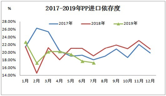 ????????由2017-2019年P(guān)P進(jìn)口依存度發(fā)現(xiàn),2019年4月份進(jìn)口依存度開始逐步下挫,7月進(jìn)口依存度同比下降1.82%,環(huán)比下降0.42%。由此數(shù)據(jù)可發(fā)現(xiàn)進(jìn)口PP產(chǎn)品在國(guó)內(nèi)依存度呈現(xiàn)逐步下降趨勢(shì)。其實(shí)這與國(guó)內(nèi)PP產(chǎn)能激增密不可分,進(jìn)口PP產(chǎn)品由于整體價(jià)高,在國(guó)內(nèi)市場(chǎng)競(jìng)爭(zhēng)優(yōu)勢(shì)逐步減弱,除部分高端專用產(chǎn)品在下游仍占據(jù)優(yōu)勢(shì)外,按照目前國(guó)內(nèi)PP擴(kuò)能計(jì)劃逐步實(shí)現(xiàn),進(jìn)口PP在國(guó)內(nèi)依存度有進(jìn)一步下降趨勢(shì)。