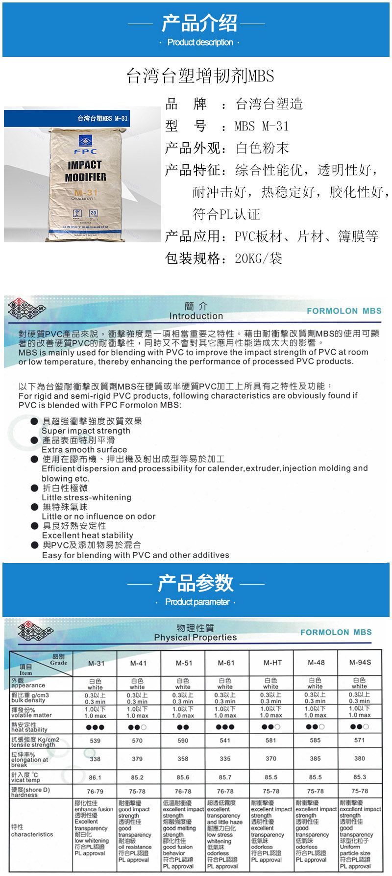 - 臺塑MBS M31綜合性能好 透明耐白化 PVC簿膜 板材片材 增韌劑M-31 物性表, 臺塑MBS M31綜合性能好 透明耐白化 PVC簿膜 板材片材 增韌劑M-31 產(chǎn)品參數(shù),臺塑MBS M31綜合性能好 透明耐白化 PVC簿膜 板材片材 增韌劑M-31 性能表,臺塑MBS M31綜合性能好 透明耐白化 PVC簿膜 板材片材 增韌劑M-31 出廠報告, MSDS,, 物質(zhì)安全資料表, UL黃卡,{ SGS報告, RoHS, 食品級認(rèn)證, NSF飲用水標(biāo)準(zhǔn), 產(chǎn)品資料, 產(chǎn)品性能, 出廠報告, 原廠原包, 代理商, 熱變形溫度, 熔指數(shù), 流動系數(shù), 抗沖擊性能、沖擊強度, 低溫韌性、低溫抗沖擊性能, 熔體流動系數(shù)、熔體流動速率, 加工工藝、加工參數(shù)、加工溫度, 歐盟RoHS 德國FDA 美國FDA 日本FDA