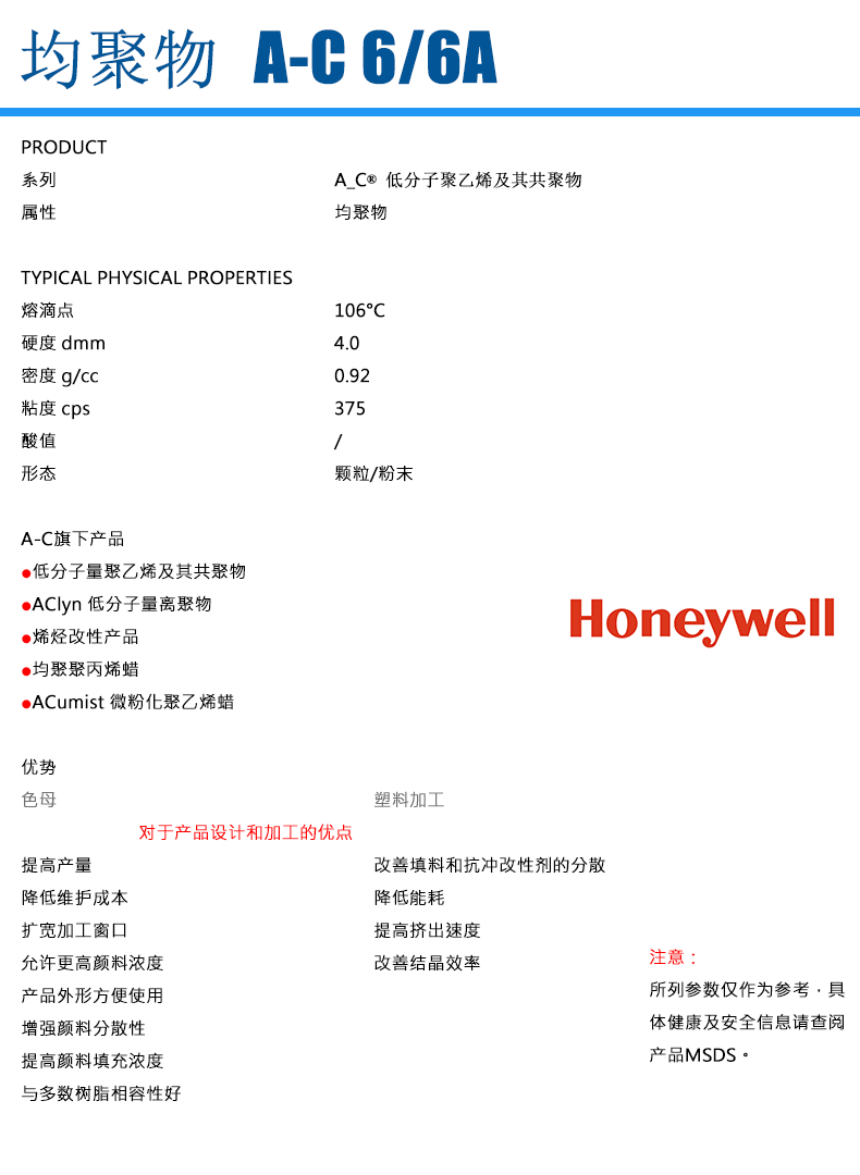- 美國霍尼韋爾 HONEYWELL AC-6A 低分子聚乙烯蠟 物性表, 美國霍尼韋爾 HONEYWELL AC-6A 低分子聚乙烯蠟 產(chǎn)品參數(shù),美國霍尼韋爾 HONEYWELL AC-6A 低分子聚乙烯蠟 性能表,美國霍尼韋爾 HONEYWELL AC-6A 低分子聚乙烯蠟 出廠報告, MSDS,, 物質(zhì)安全資料表, UL黃卡,{ SGS報告, RoHS, 食品級認證, NSF飲用水標準, 產(chǎn)品資料, 產(chǎn)品性能, 出廠報告, 原廠原包, 代理商, 熱變形溫度, 熔指數(shù), 流動系數(shù), 抗沖擊性能、沖擊強度, 低溫韌性、低溫抗沖擊性能, 熔體流動系數(shù)、熔體流動速率, 加工工藝、加工參數(shù)、加工溫度, 歐盟RoHS 德國FDA 美國FDA 日本FDA